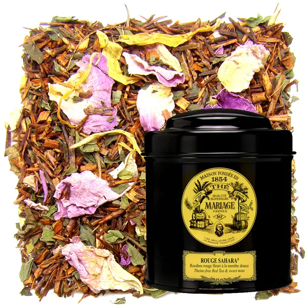 Rooibos: Means "red bush" and it's technically not tea as it comes from a South African plant in the legume family. Caffeine free it has a whole host of medicinal benefits such as being an anti-inflammatory. Rooibos tea is rich in many mineral contents such as iron, calcium, potassium, copper, fluoride, manganese, zinc, magnesium and alpha hydroxy acid. Personally, I really like the Rouge Sahara from Mariage Freres but this particular flavor is impossible to find in the US so far so you simply must go to Paris. Their tins are classically beautiful too.