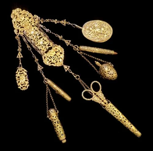 Most of the chatelaines that are still in existence are the more common utilitarian variety, made of simpler materials and worn at home like this one below which contains scissors, a pincushion, a locket, a tape measure, a needle book, a thimble holder etc. and clearly belonged to a lady who enjoyed her sewing.